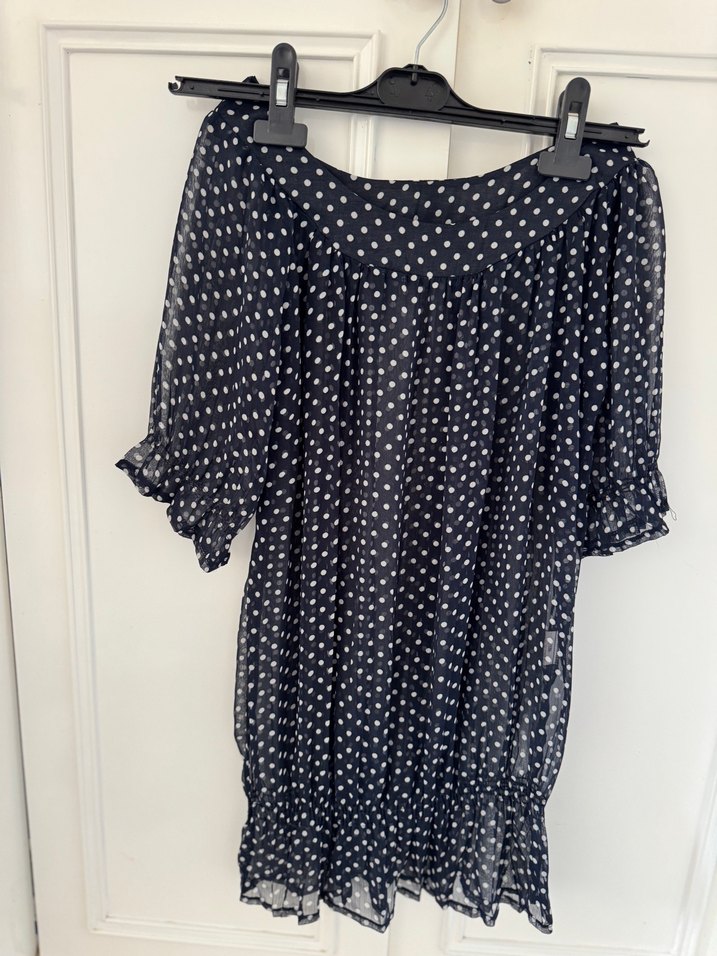 Siyah beyaz puantiyeli, bol kesim midi bluz. Kayık yaka ve kısa kollarda fırfır detaylı, yumuşak sentetik kumaştan günlük sokak stili için uygun.