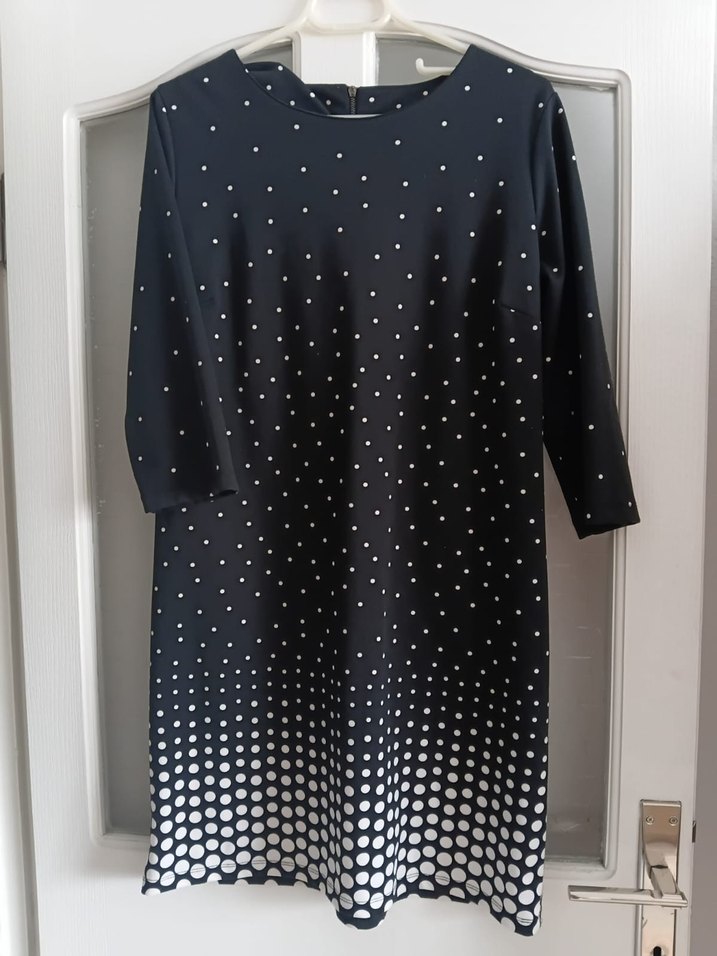 , bol kesim, yuvarlak yaka ve uzun kolludur. Pileli, puantiyeli deseni etek ucuna doğru yoğunlaşarak şık bir geçiş sağlar. Sentetik kumaştan üretilmiştir, günlük kullanıma uygundur.