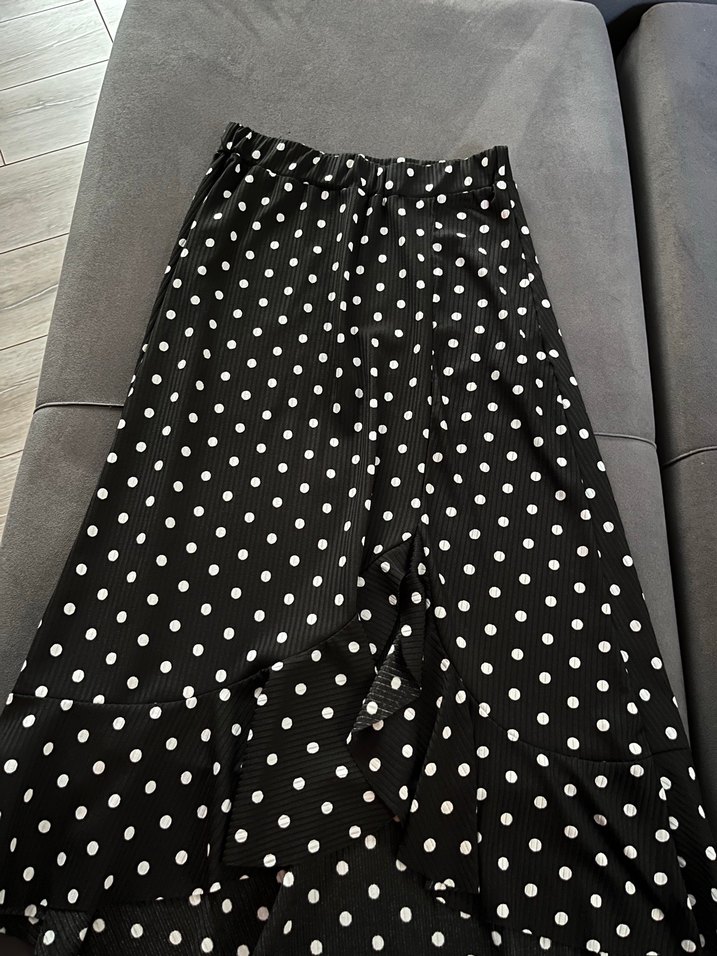 Beyaz puantiyeli siyah midi etek, bol kesim ve yırtmaç detaylı. Yumuşak sentetik kumaştan, günlük bohem stil için uygun. M beden