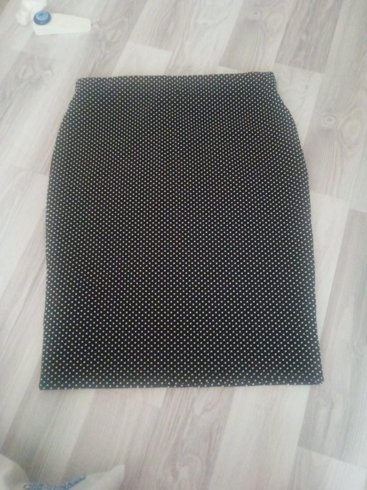 Gri puantiyeli siyah midi kalem etek, sentetik kumaştan, yapışkanlı bant kapanışa sahip, günlük kullanım için uygundur.