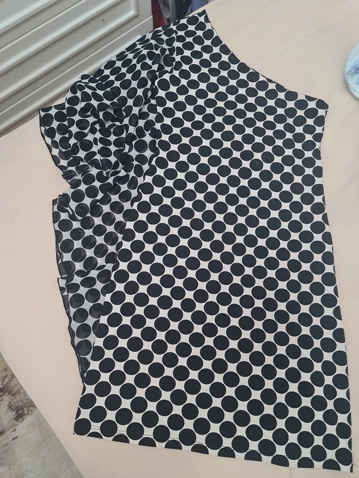 Kolsuz, tekne yaka ve pile detaylı hamile bluzu. Siyah puantiyeli desende, uzun ve vücuda oturan kesime sahip, çağdaş ve minimalist tarzda.marka temsili