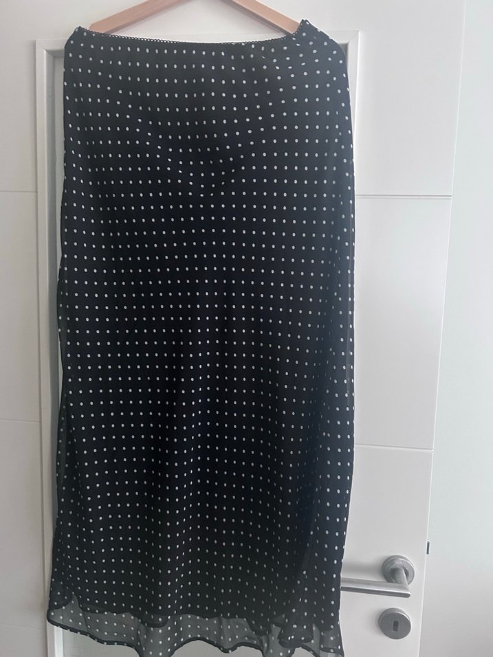 Siyah uzun etek, puantiyeli deseni ve piliseli detayları ile bol kesimdir. Yumuşak sentetik kumaştan günlük kullanım için uygundur. Boy 100 tül ve altında astarı var