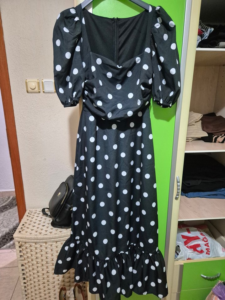 Siyah uzun elbise, beyaz puantiyeler,etek ucunda fırfır detaylarıyla. prenses balon kolları ve vücuda oturan kesimiyle bohem tarzı için uygun.