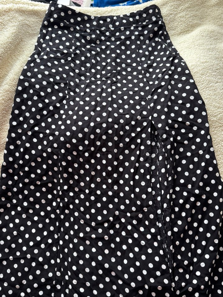 Siyah zemin üzerine beyaz puantiyeli, düğmeli uzun ve fitted etek. Rahat, bohem tarzda sokak giyimi için uygundur.