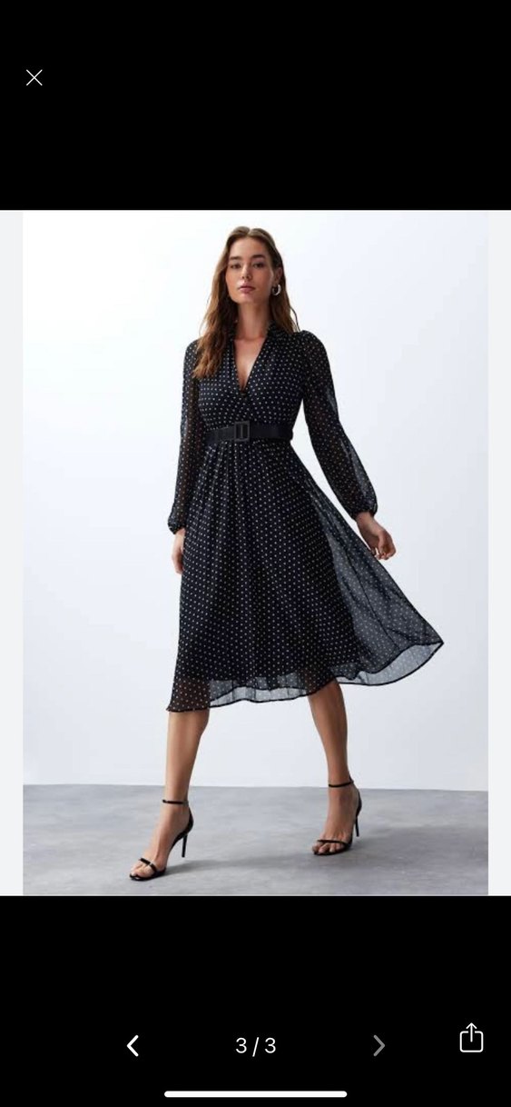 Siyah uzun elbise, V yaka ve pileli etekli bol kesimdir. Uzun kollu ve puantiyeli desene sahiptir, ofis için uygundur.