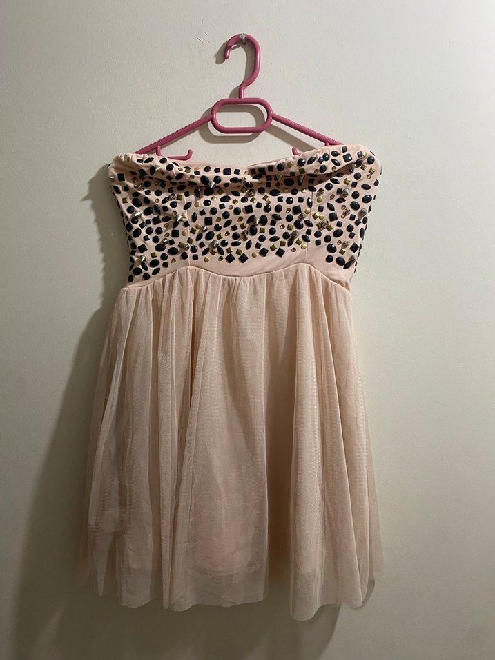 Puantiye desenli straplez, hafif pembe midi boy abiye elbise.