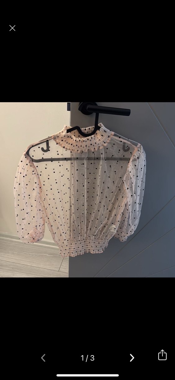 Yüksek yakalı, uzun kollu, transparan pembe bluz, puantiyeli desende ve hafif sentetik kumaştan, trend günlük stil için uygun. 1 kez giydim hicbir sorunu yok