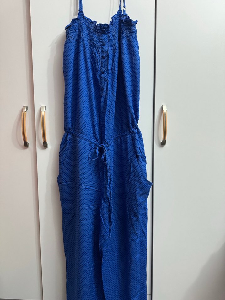 Puantiyeli tulum, belden bağlamalı yumuşak kumaş tam yazlık. S-M uyumlu
