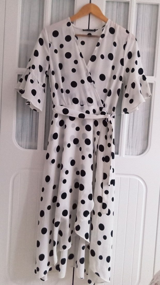 V yaka, kısa fırfırlı kollu, bol kesim uzun elbise. Puantiyeli desen ve bel bağlama detaylı bohem tarz. Yumuşak sentetik kumaş.kol altı en 46 bel 35 boy 120cm ön kısım 10cm kadar kısa alt kısmı astarlı yandan fermuarlı