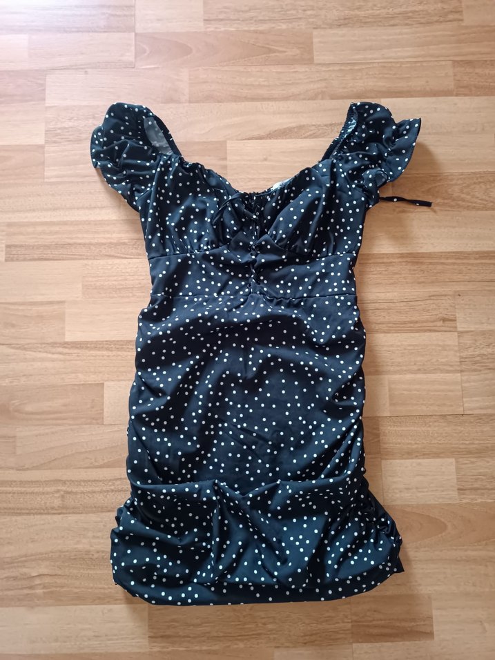 , puantiyeli, V yaka ve kısa kollu, midi boyda, vücuda oturan gece elbisesi.