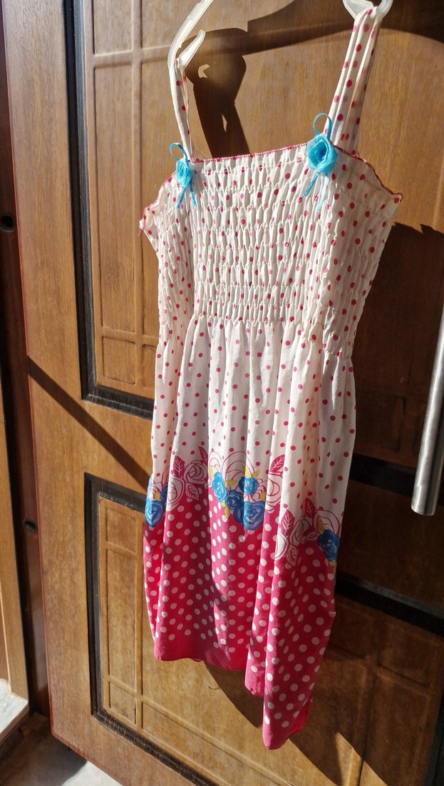 Puantiyeli ve çiçek desenli, askılı bohem kız elbisesi. Büzgülü, pileli ve bol kesimli, yumuşak dokulu tekstil kumaştan yapılmıştır.