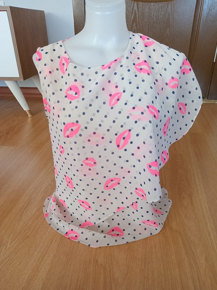 Kısa kollu, yuvarlak yakalı, sentetik kumaştan üretilmiş, puantiyeli ve pembe dudak desenli,