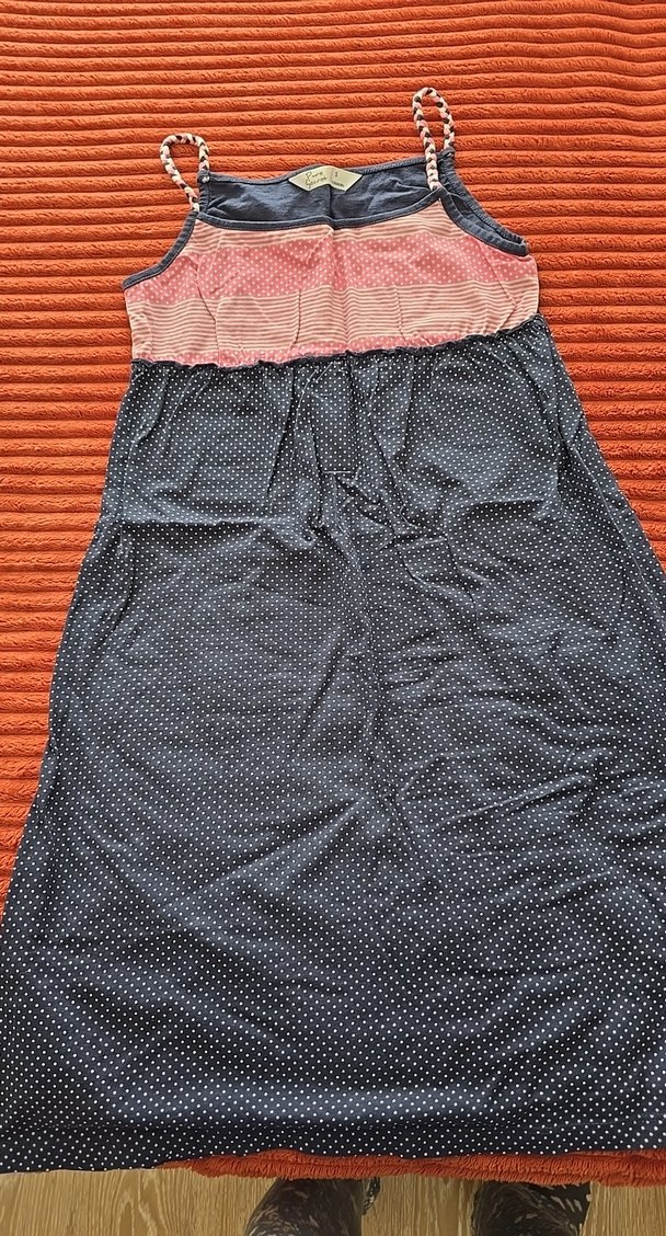 Pembe pileli üst kısmı ve koyu puantiyeli eteğiyle uzun, vücuda oturan gecelik elbise Günlük kullanıma uygun rahat bohem tarz.