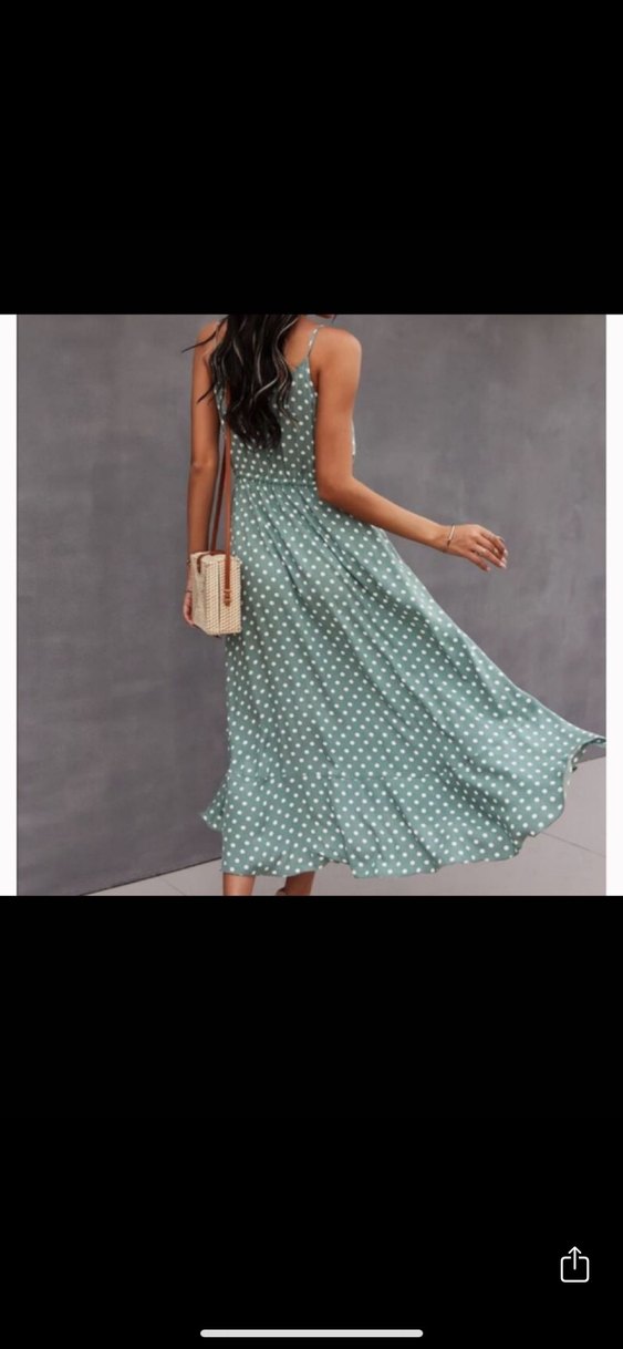 Yumuşak sentetik kumaştan, pilili, uzun ve bol kesim, pastel yeşil puantiyeli bohem elbise