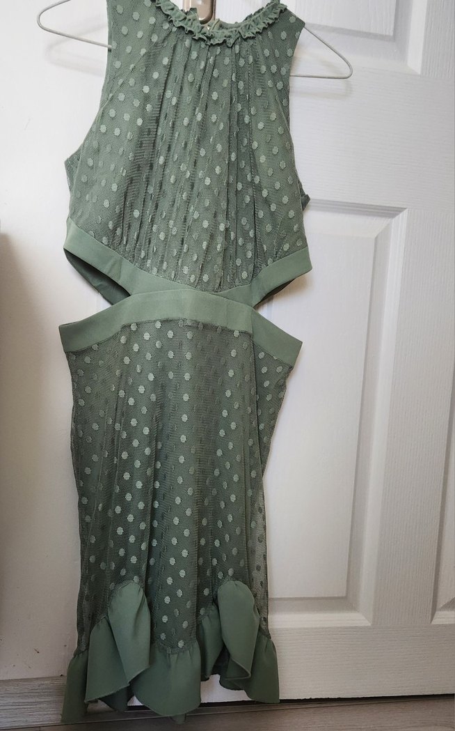 Yeşil renkte, yüksek yakalı ve kolsuz, pilili dokulu puantiyeli uzun abiye elbise. Kesik detaylarıyla dış mekan etkinliklerine uygun.