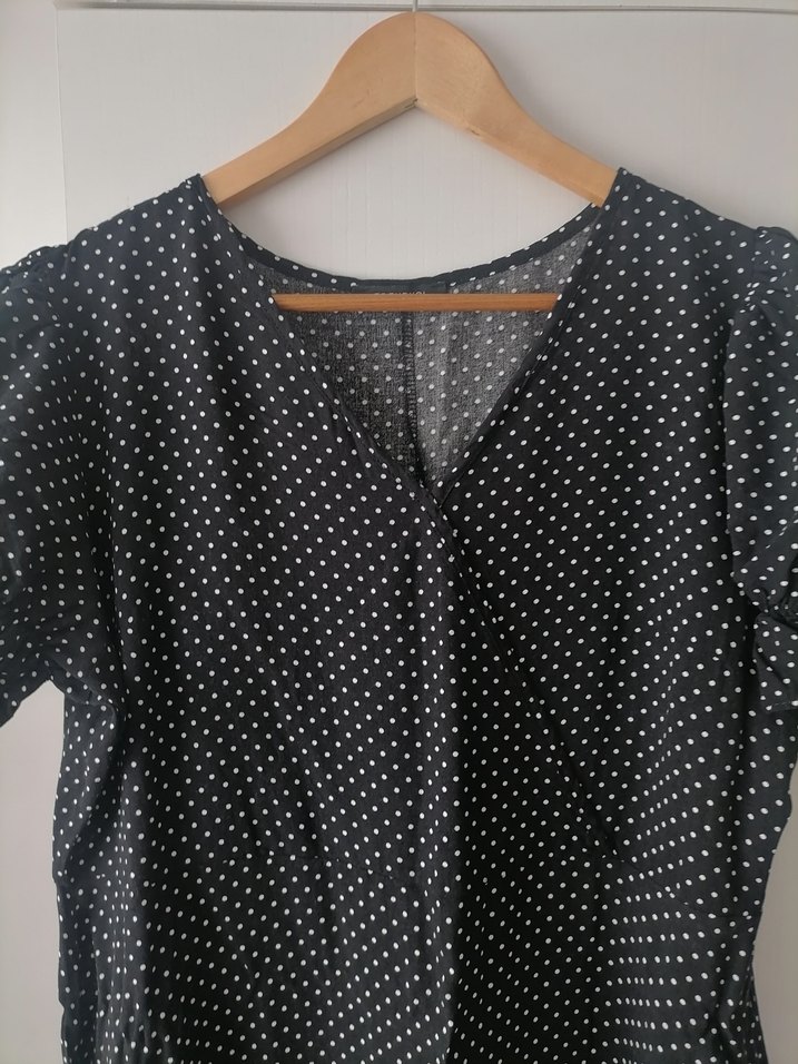 , V yaka ve kısa kollu. Rahat kesim, ve puantiyeli desene sahip, günlük sokak stili için uygun. Belden aşağı kloş viskon kumaş çok rahat bir elbise, göğüs 114, bel 100, boydan uzunluk 96 santim dir.
