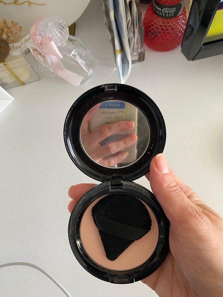 Pudra içinden ayna ve sünger aplikatör çıkan kompakt pudra. Birkaç defa kullanıldı sorunu yoktur