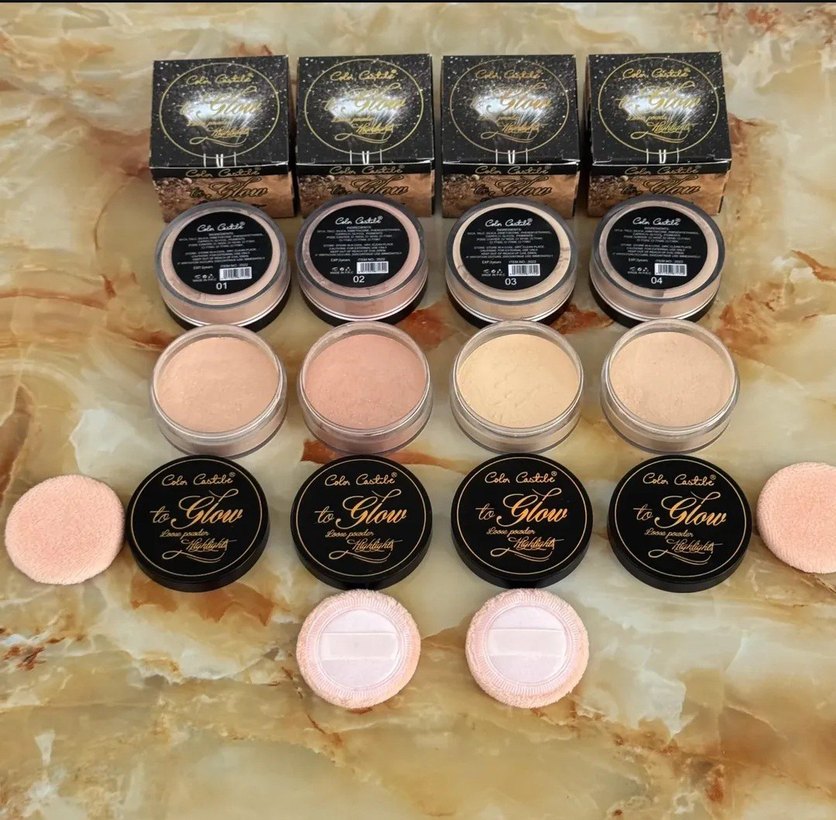 Işıltılı bitişli, dört farklı tonda bej yüz pudrası seti. Pürüzsüz uygulama için sünger aparatlar dahildir. ✨