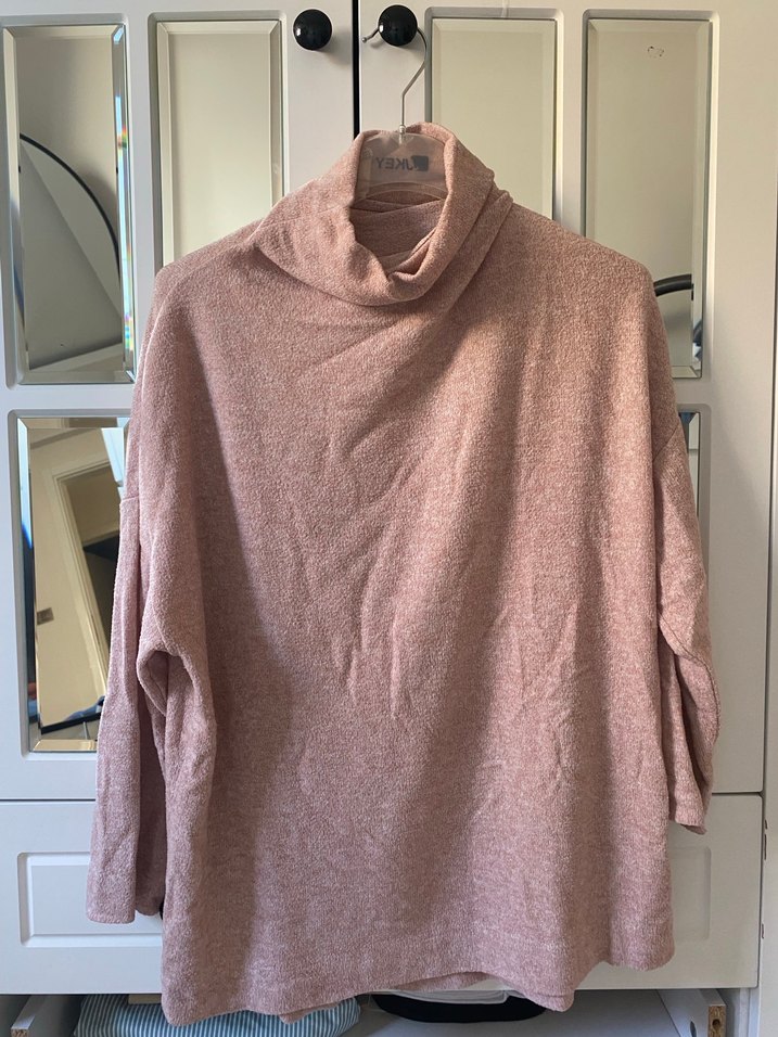 Yumuşak keten kumaştan, balıkçı yaka ve uzun kollu, bol kesim bej örgü kazak. Günlük rahat kullanıma uygun.