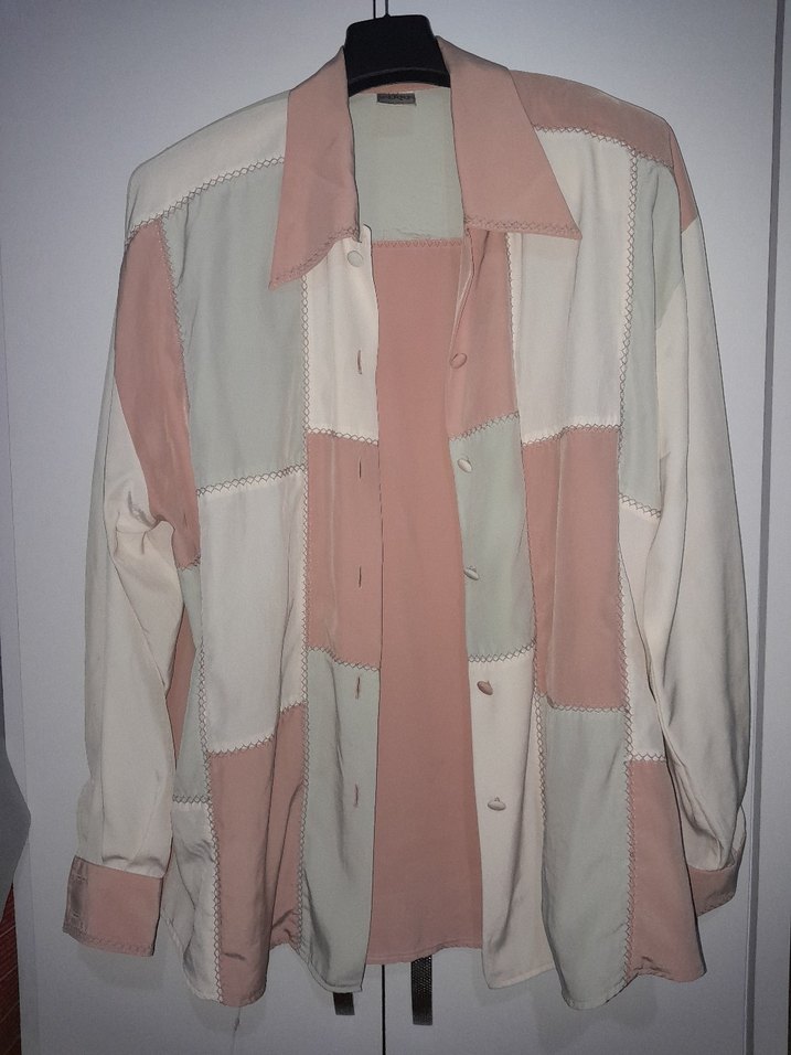 Kadınlar için düğmeli, uzun kollu ve gevşek kesim gömlek. İpek gibi kumaştan yapılmış, pastel pembe ve beyaz patchwork desenli. Günlük ve şık Paris tarzı için uygundur. kolunda ve sırtında küçük lekeler var M beden