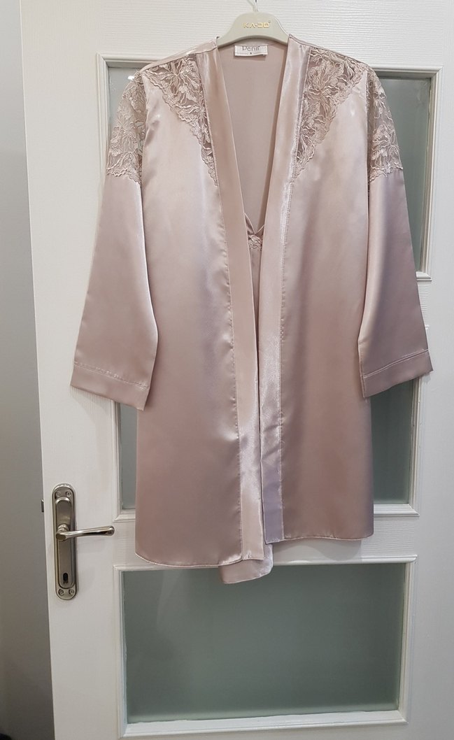 pudra, ip askılı, dantel detaylı ve yumuşak dokulu, rahat hissettiren bohem tarzda midi uzunlukta dar kesim kadın gecelik.