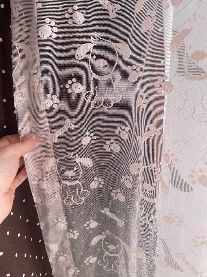 Pudra renkte, bohem tarzda, baskılı köpek ve pati desenlerine sahip yumuşak tül perde. Odaya eğlenceli bir dokunuş katar. Eni 140cm sık pile