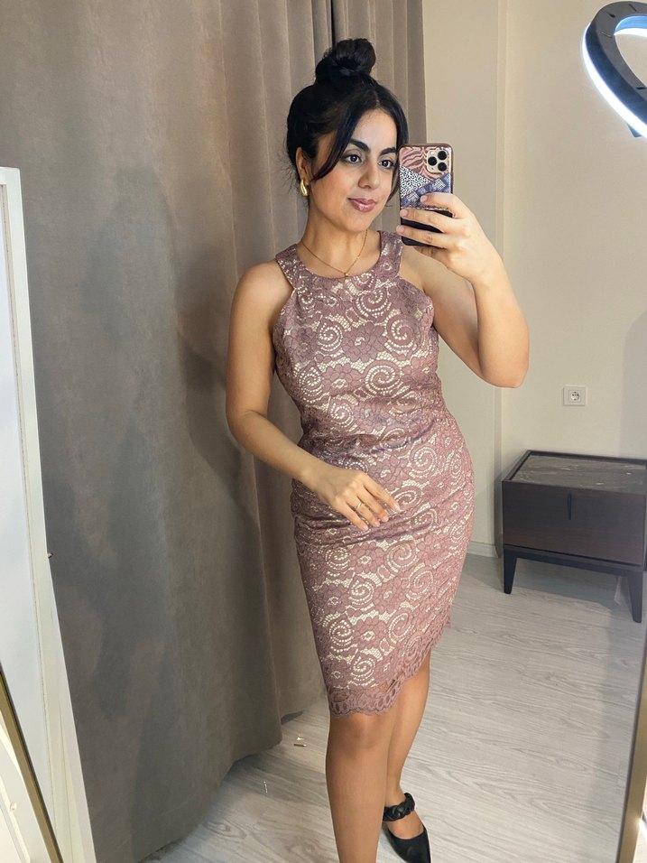 Pudra renkli, dantel detaylı kolsuz midi abiye elbise. Romantik akşamlar için uygun. Boyu 1 metre iki koltuk altı arası 50 cm baseni 50 cm’dir.
