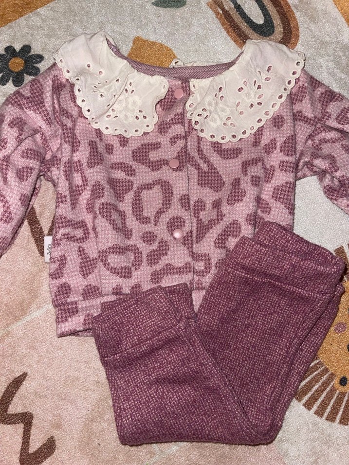 Pastel pudra, uzun kollu ve dantel yakalı bebek kız takımı. Hafif batik desenli, yumuşak ve rahat kumaş.