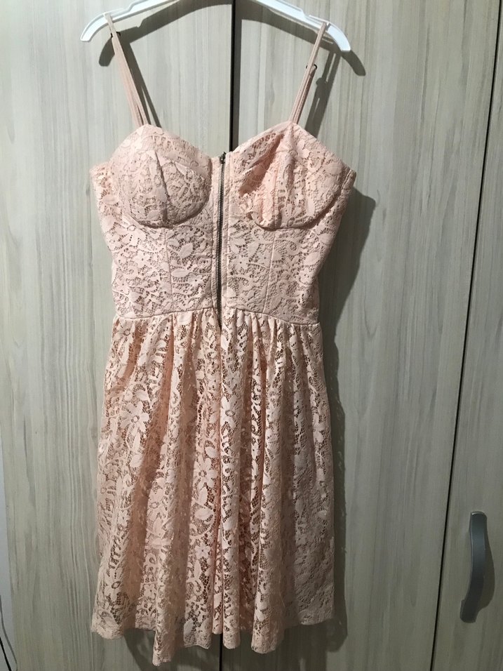 Pastel pudra renkli, ince ayarlanabilir askılı, ön fermuarlı dantelli diz üstü elbise. Bohem tarzda klasik şıklık sunar, parti, mezuniyet için uygundur.