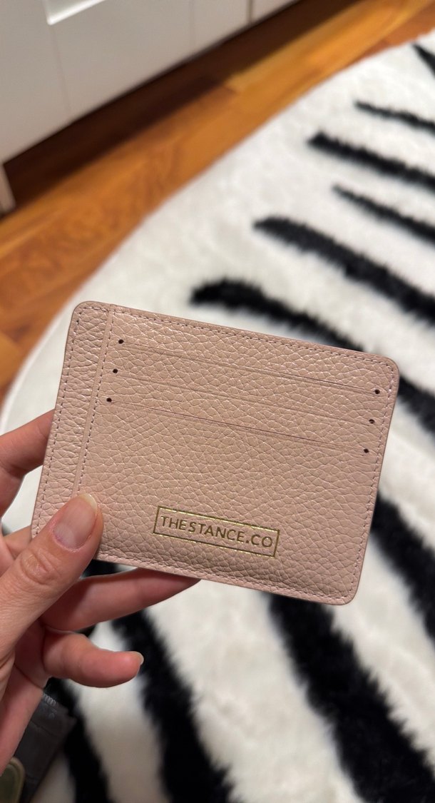 Pudra renkte, deri kadın cüzdanı, elastik detaylı ve deseniz. Paris sokak modasına uygun, günlük kullanım için idealdir. Üzerinde THESTANCE.CO yazısı bulunur.