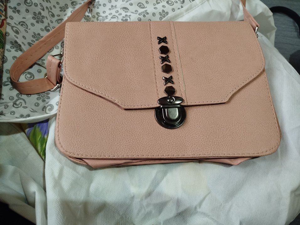 Pudra renkte deri kadın çanta, tokalı kapama ve baskılı minimalist desene sahip, günlük kullanıma uygun.