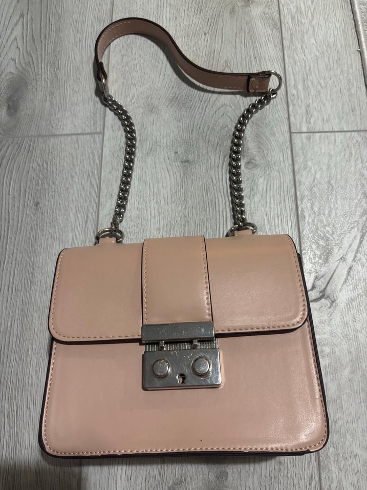 Bershka marka. Ürün çok temiz 2-3 defa kullanıldı. Pudra deri kadın çanta, zincir detaylı ve kilitli kapaklıdır. Günlük kullanım için uygun, trend sokak tarzına uygundur. İç etiketiyle kullanamadığım için kestim.