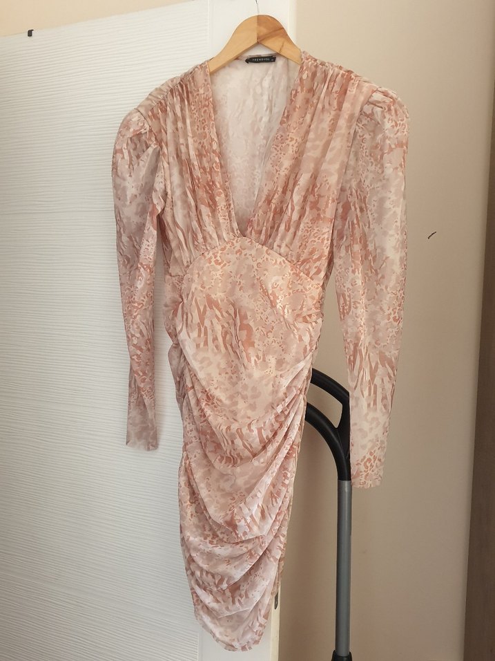 Bej renkte, yılan desenli, drapeli ve uzun kollu, V yakalı, fit kesim uzun elbisedir. Romantik akşamlar için uygundur.