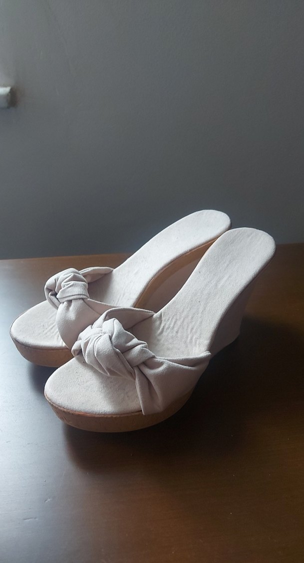 Pudra dolgu topuklu kadın terlikler, rahat kauçuk taban ve düğümlü kumaş bantla günlük kullanıma uygun, sade ve şık bir görünüm sunar. Bohem ve retro tarzlara uygundur.