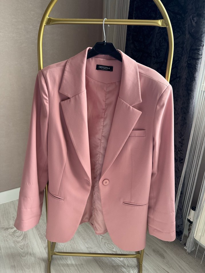 Pudra renkli kadın blazer ceket, dik yakalı ve düğmeli kısa kesimdir. İpek gibi kumaştan yapılmış, modern klasik tarzda ve askılı kolludur. Ofis için uygundur.