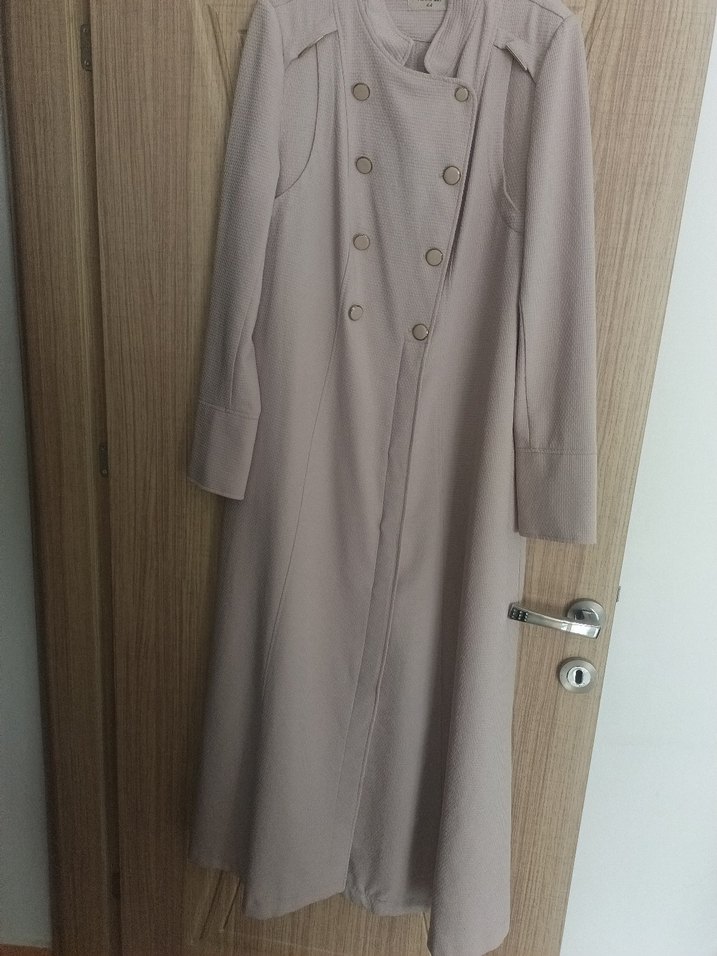 pudra renkli, düğmeli, uzun kadın pardesü. çift sıra düğmeli tasarıma sahiptir. mevsimlik kumaştır. 44 bedendir. çok severek kullandım ama kilo aldığım için satıyorum. kolundaki düğmesinin taşı düşmüştür.