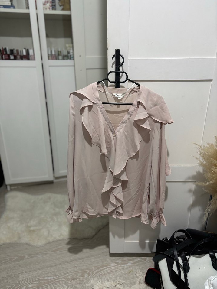 Pudra Fırfırlı V Yakalı Keten Bluz