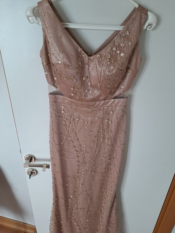 Pudra İşlemeli V Yakalı Uzun Abiye Elbise
