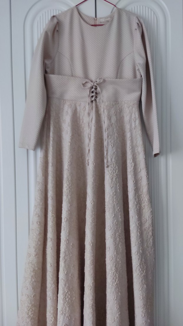 Pudra renginde, kaftan tarzı bir kumaştan, göğüs altından oturtmalı kloş bir elbisedir. Abimin düğünü için almıştım, İki defa giydim yeni gibi duruyor.