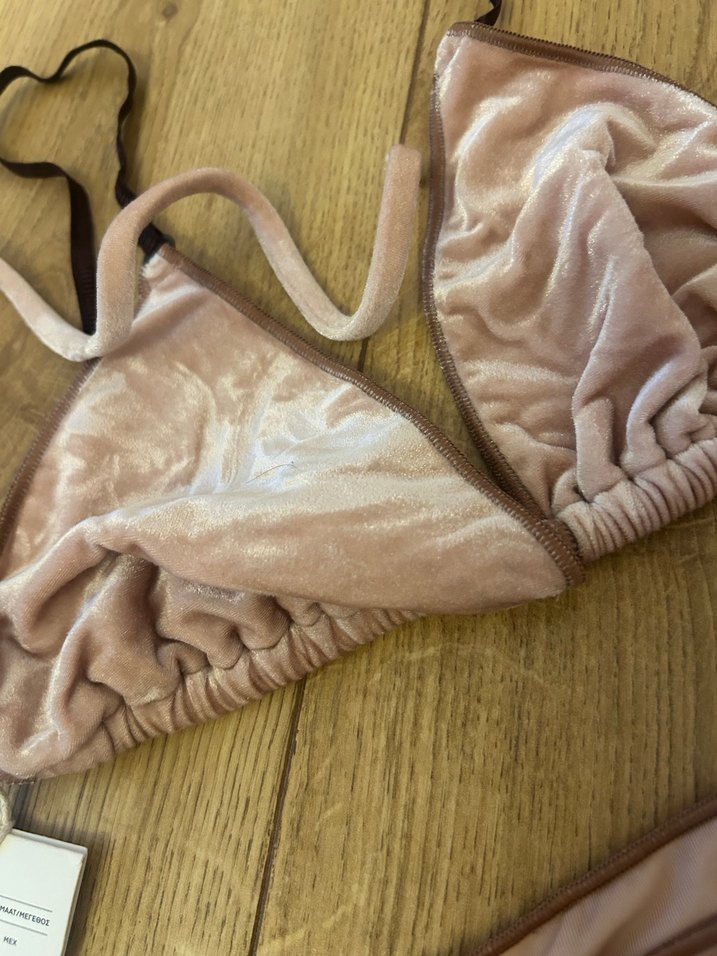 Yumuşak ve rahat kumaştan, bohem tarzda pudra renkli kadın bikini.