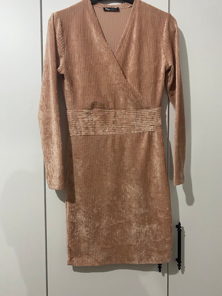 Pudra renkli, uzun kollu ve vücuda oturan midi elbise, parlak kadifedir. Kışlık kullanıma uygundur ürünün hiçbir kusuru yoktur