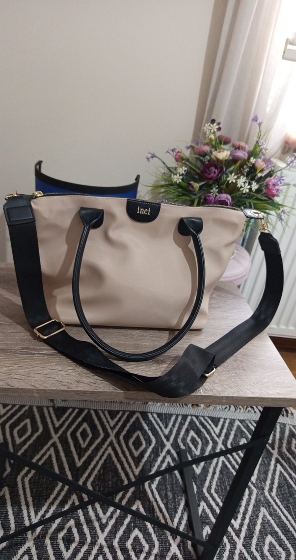 Pudra kadın çantası, siyah kulplar ve ayarlanabilir tokalı askı ile günlük ve sokak stiline uygun, desensiz ve hafif pudra tonludur.