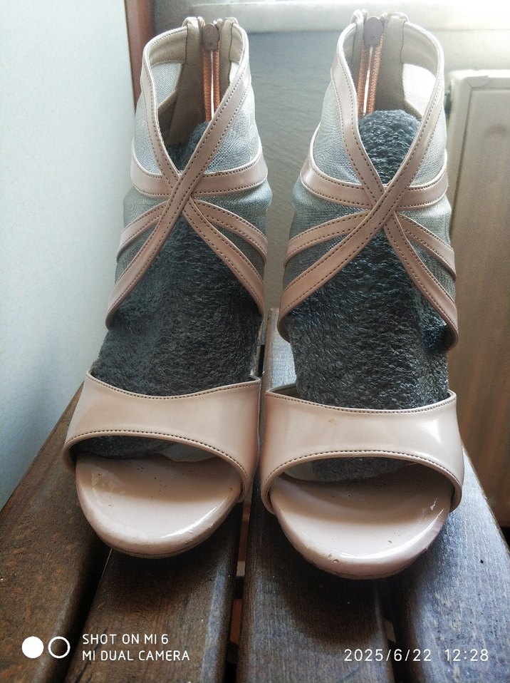 Pudra renkte, platform topuklu ve tokalı kayışlı kadın ayakkabı. Kauçuk malzemeden, günlük kullanıma uygun çağdaş tarzda.