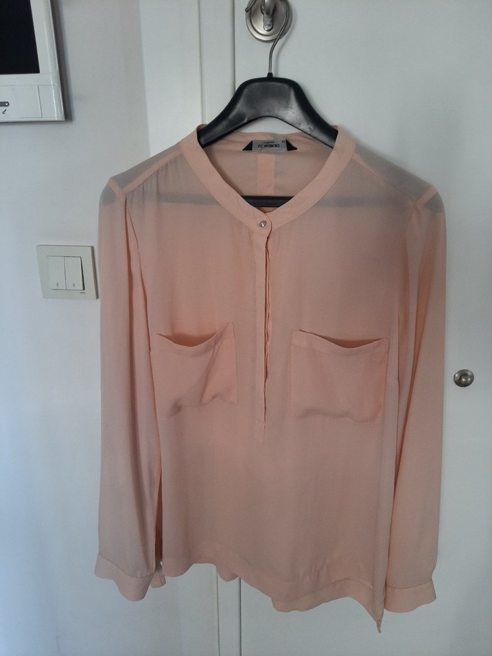 Sayılı giyildi. Temiz ve yeni durumda. Hiçbir sorunu yok. Pudra renginde, düğmeli, uzun kollu ve yuvarlak yakalı, şifon, rahat kesim kadın gömlek. Minimalist ofis tarzı için uygun.