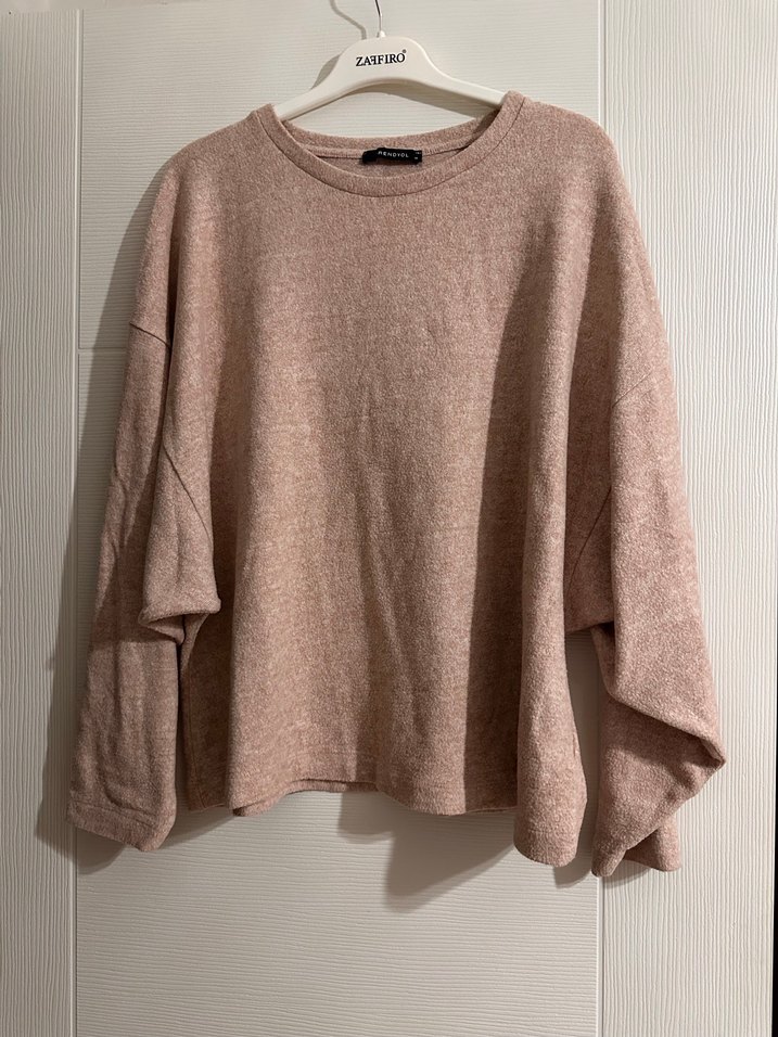 Pudra renkli, uzun kollu, yumuşak kumaş, bisiklet yaka ve bol kesim kadın kazağı. Yumuşak kumaştan üretilmiş, sade ve desensiz, günlük kullanıma uygun rahat bir parça.