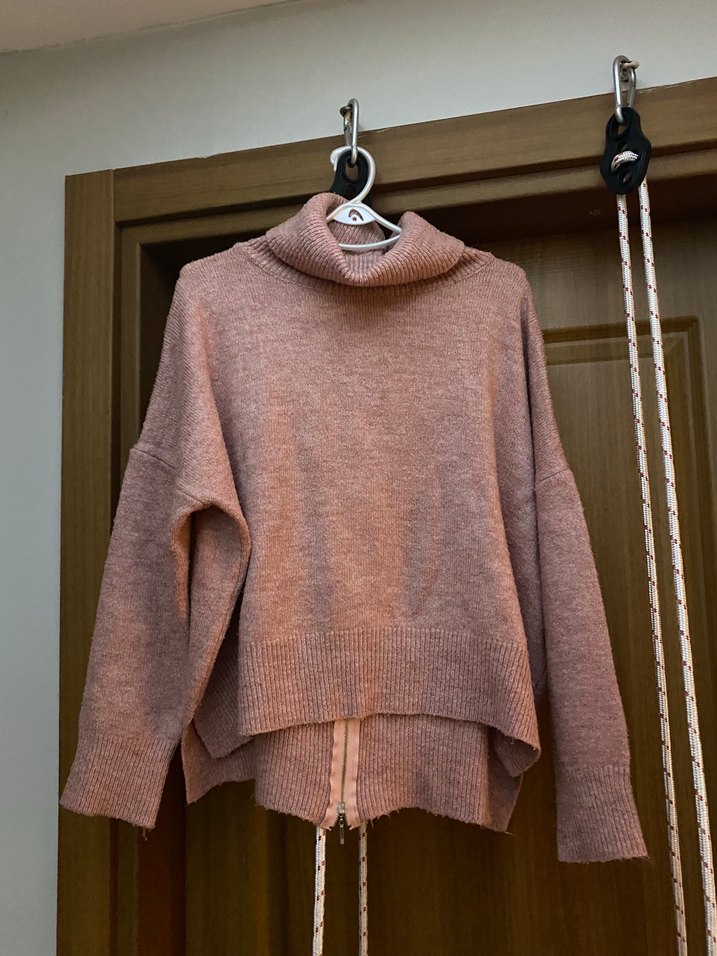 Yumuşak örgüden yapılmış pudra renkli, boğazlı ve bol kesim kadın kazak. Uzun kollu ve normal boyda, rahat günlük kullanım için uygundur. Sırt fermuar detaylı arka kısımı bir tık daha uzun