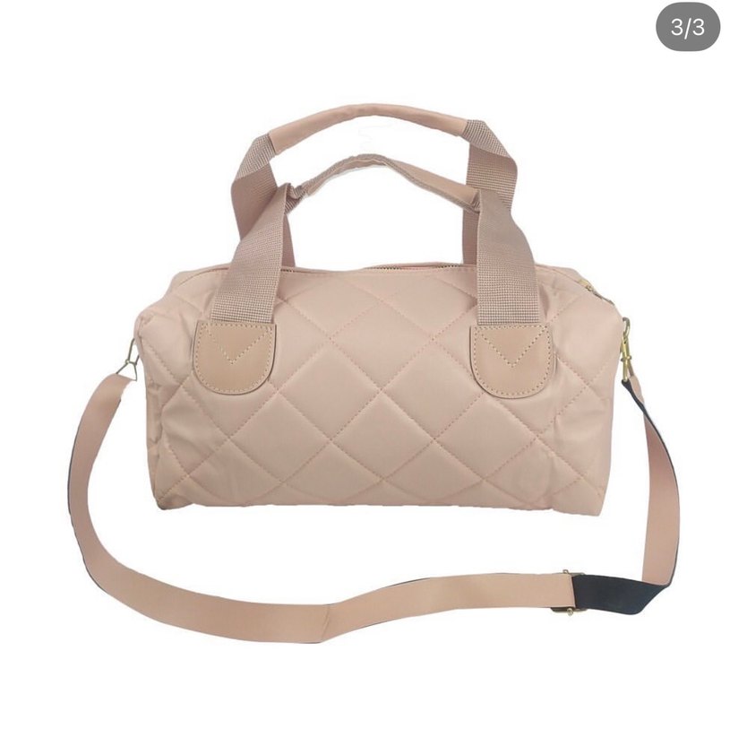 pudra pembe renkte, kapitone desenli, kemerli ve ayarlanabilir askılı kadın çantası, günlük kullanım için uygundur. hiç kullanılmadı sıfr