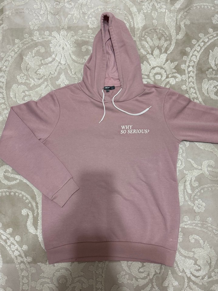 Pastel pudra renkli, kapüşonlu kadın sweatshirtü, uzun kollu ve bol kesimdir. Yumuşak ve sıcak kumaştan yapılmıştır, dantel detayları ve göğüste "WHY SO SERIOUS?" yazısı bulunur. Rahat ve günlük kullanım için uygundur.