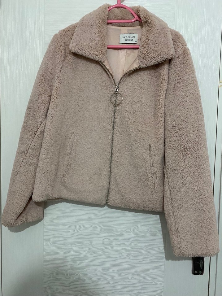 Pudra renkte, ışıktan dolayı koyu görünüyor. Peluş kumaştan kısa boylu kadın ceketi. Kürklü yaka ve uzun kollu, rahat kesim ile günlük şıklık sağlar.
