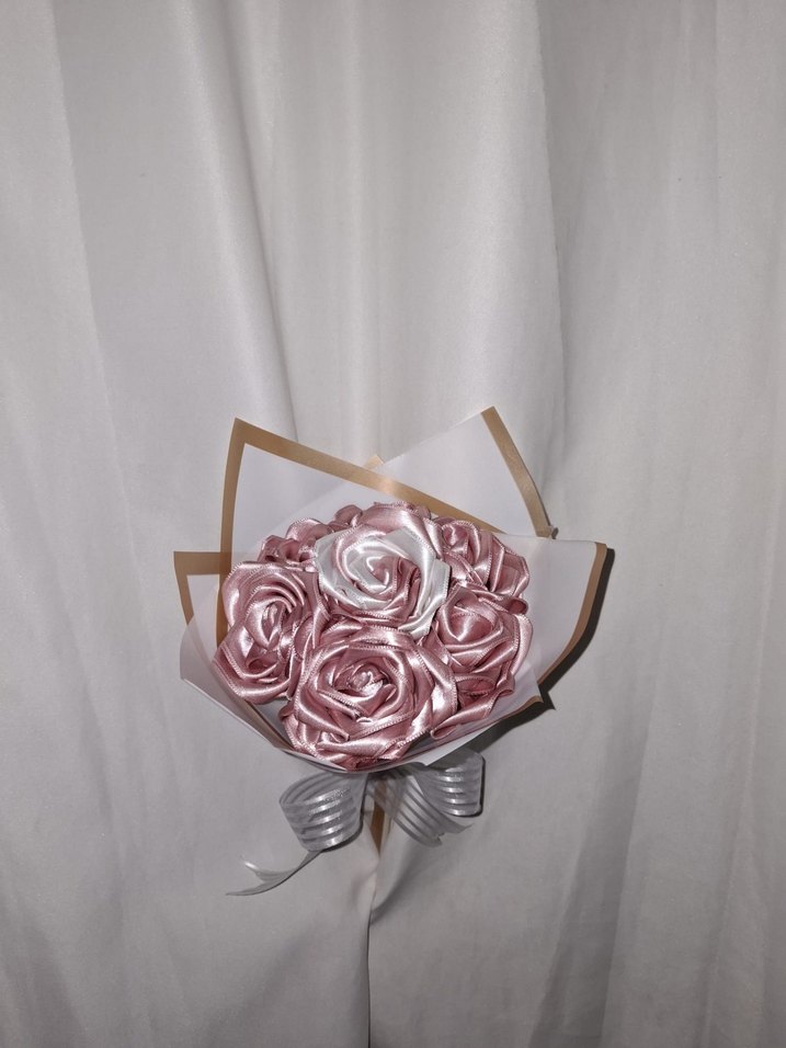 Beyaz buket kağıdına sarılmış pudra kurdele çiçek buketi. Sevdikleriniz için solmayacak bir buket. Sipariş alınır.